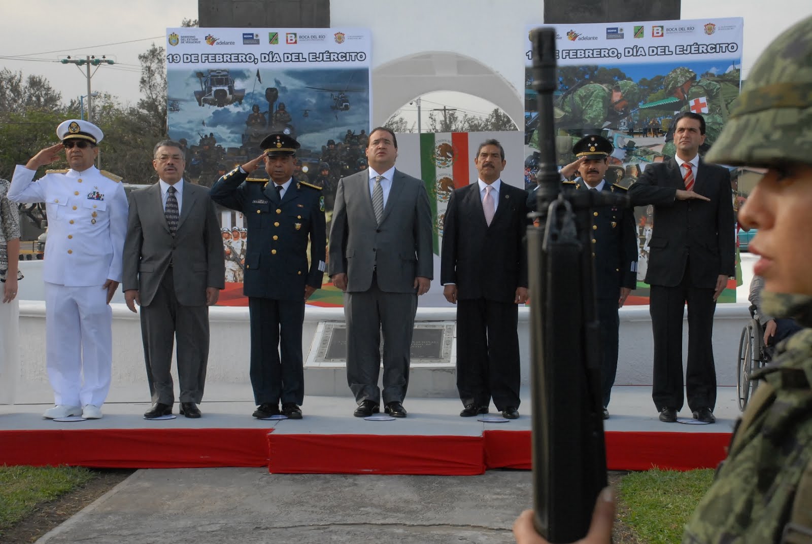 Veracruz, Ver., 19 de Febrero de 2012.-El gobernador Javier Duarte de Ochoa encabezó una Guardia de Honor y depositó una ofrenda floral ante el Monumento al Soldado, ubicado en la avenida Díaz Mirón frente al Campo Militar número 26 de la VI Región militar con motivo del 99 aniversario del Ejército Mexicano. Le acompañan el General René Carlos Aguilar Páez, el Vicealmirante Víctor Manuel Carvallo, Comandante de la Tercera Zona Naval, y los alcaldes Carolina Gudiño Corro, de Veracruz, y Salvador Manzur Díaz, de Boca del Río, entre otros.